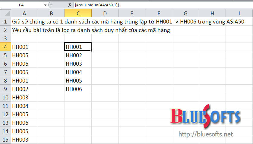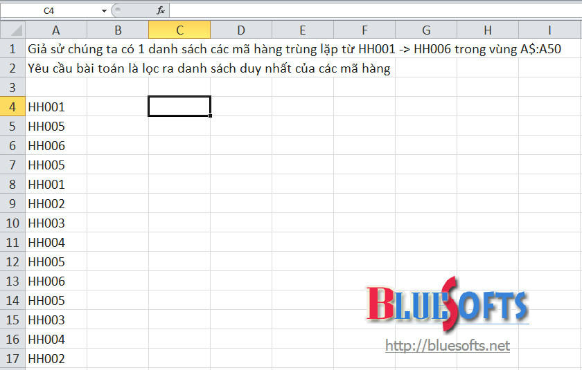 Giả sử ta có 1 bài toán như sau: Giả sử chúng ta có 1 danh sách các mã hàng trùng lặp từ HH001 -> HH006 trong vùng A4:A50, yêu cầu bài toán là lọc ra danh sách duy nhất của các mã hàng trong vùng trên.