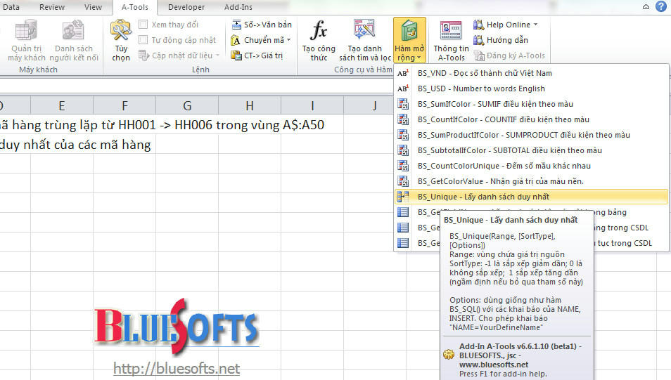 Bước 1: Đặt chuột vào ô đầu tiên cần trả về kết quả, vào menu A-Tools trên thanh công cụ Excel, các bạn chọn vào "Hàm mở rộng" -> chọn tới hàm "BS_Unique".