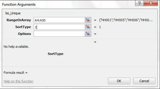 Bước 2: Tại RangeOrArray các bạn chọn vùng dữ liệu cần lọc danh sách duy nhất (bài toán ở đây là A4:A50), trong phần SortType là phương pháp lọc tăng dần hay giảm dần, nếu là không điền gì (ngầm đình là 1-> tăng dần), điền 0 là giảm dần. Option là tham số chính thứ 2, có thể đặt tên vùng, chèn dòng,...(không có cũng không ảnh hưởng).