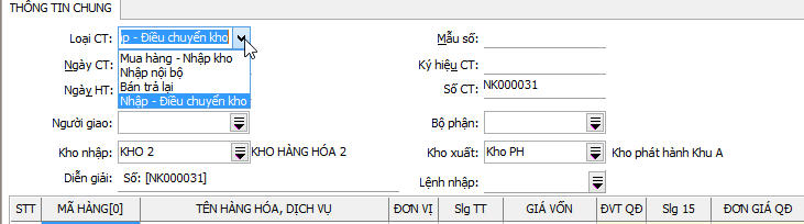 - Phần nhập liệu: Chọn nhập, xuất từ 1 hoặc nhiều kho. Chứng từ có các loại giao dịch Nhập kho, xuất kho và điều chuyển kho