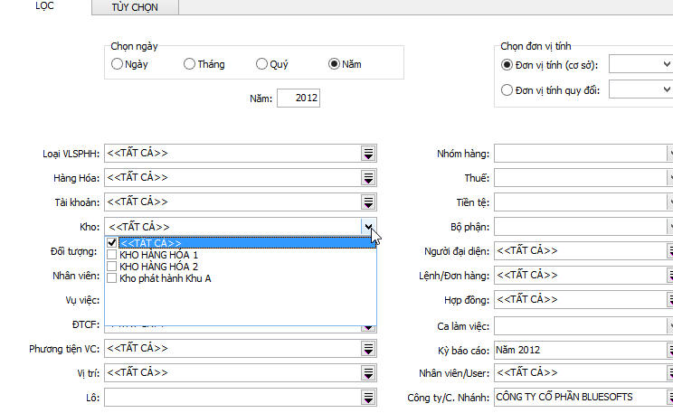 Khi lên báo cáo có thể xem cho tất cả các kho hoặc xem cho từng kho cụ thể.